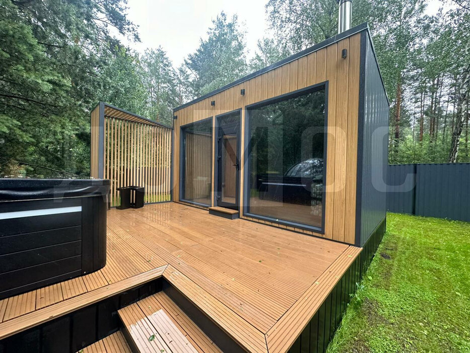 Система теплых полов во всем помещении.- Печь дровяная Harvia;- Отделка сауны - Абаш, покрытие Tikkurila Sauna.- Профессиональная уличная Спа джакузи Joyee.