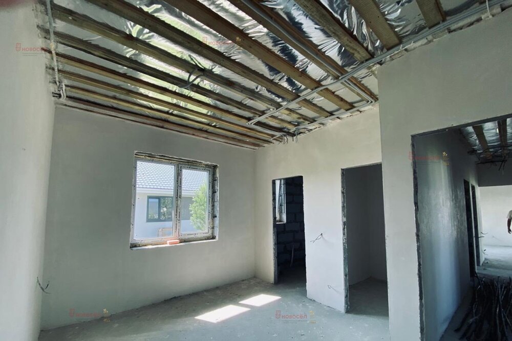 В доме просторная кухня -гостиная с панорамными окнами и выходом на террасу, высота потолка 4,5м. Две изолированные комнаты и мастер-спальня с собственным санузлом и гардеробной. Отопление электрический котёл 18 кВт, тёплый пол по периметру пола. Скважина 60 м, вода чистая питьевая. Имеется дополнительный вывод воды во двор для технических нужд.