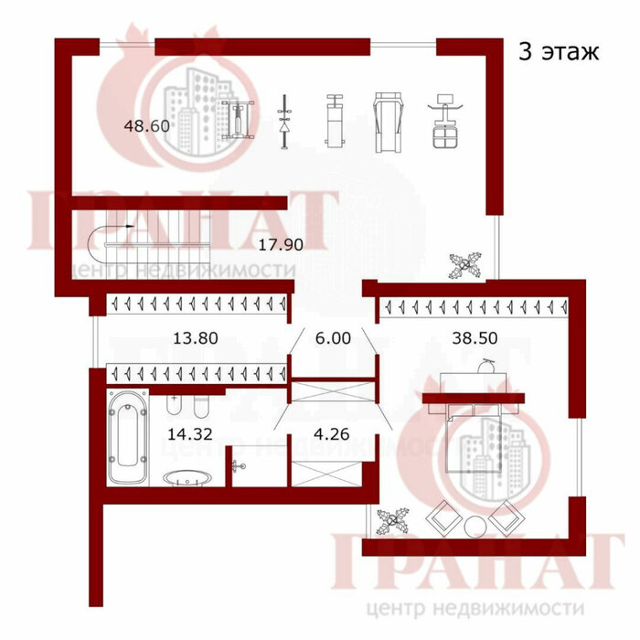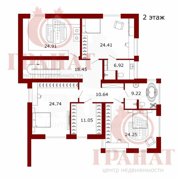 По широкой комфортной лестнице, выполненной по индивидуальному дизайнерскому проекту с элементами ковки, вы попадаете на второй этаж, где расположены три больших спальных комнаты, одна из которых с балконом, огромная ванная с джакузи и прачечная комната.