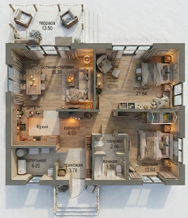 Общая и жилая площадь — 74 м². Компактное, современное планировочное решение: ни одного бесполезного квадрата, максимум простора и света — ощущение свободы даже в небольшом доме!