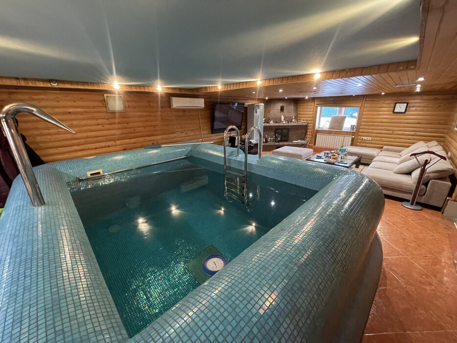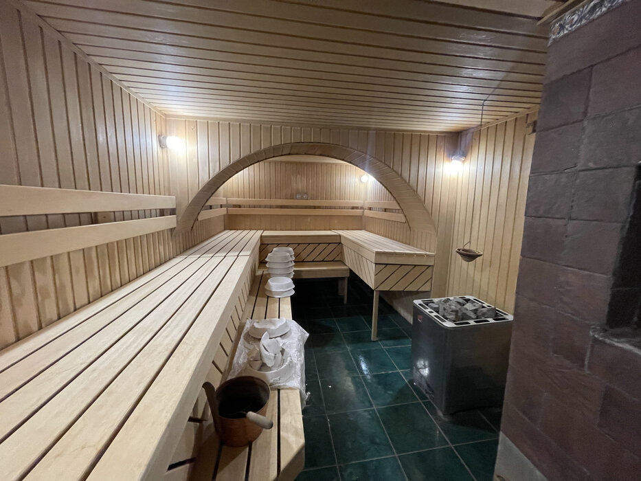 На первом этаже банного комплекса расположены баня, комната отдыха с большим диваном и телевизором, бассейн( Ширина 4м -Длина 3м -Глубина 2м), небольшая кухня, с выходом на веранду, санузел. На втором этаже банного комплекса тренажерный зал, бильярдная комната и зимний сад. На третьем этаже банного комплекса большая спальня со своим санузлом.