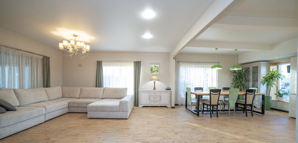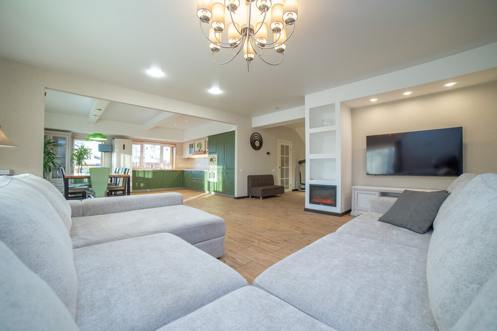 Первый этаж:- Кухня - гостиная 57,4 м2 (кухонный гарнитур с страиваемой техникой, холодильник LG, большой обеденный стол, корпусная мебель, большой угловой диван, TV Haier60”, электрокамин).- Гостевой туалет 3м2- Две спальни по 14,5 м2 и 14,4 м2-Гардеробная 5 м2- Санузел с душем 7 м2- Кладовая 4.8 м2- Газовая котельная 7,3 м2- Гараж 49 м2 на два машиноместа с большой зоной хранения по периметру- Терраса застекленная 43,8 м2.