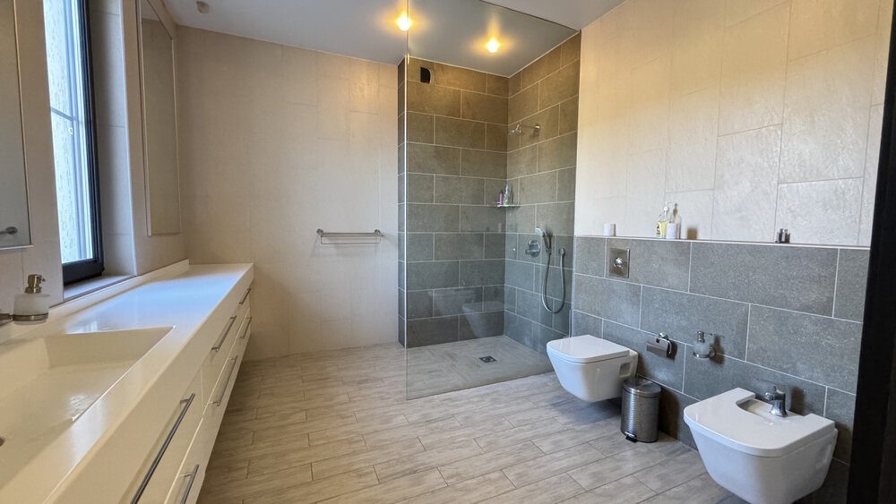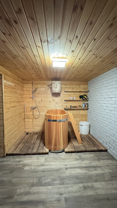 На первом этаже: кухня-гостиная со вторым светом, комната с бассейном с выходом на террасу с крытой беседкой, мангальной зоной. В подвале: мастерская с дорогостоящим уникальным оборудованием, комната отдыха, сауна с купелью, все инженерные комнаты, включая обслуживание бассейна. На втором этаже: три просторных спальни и большой санузел.