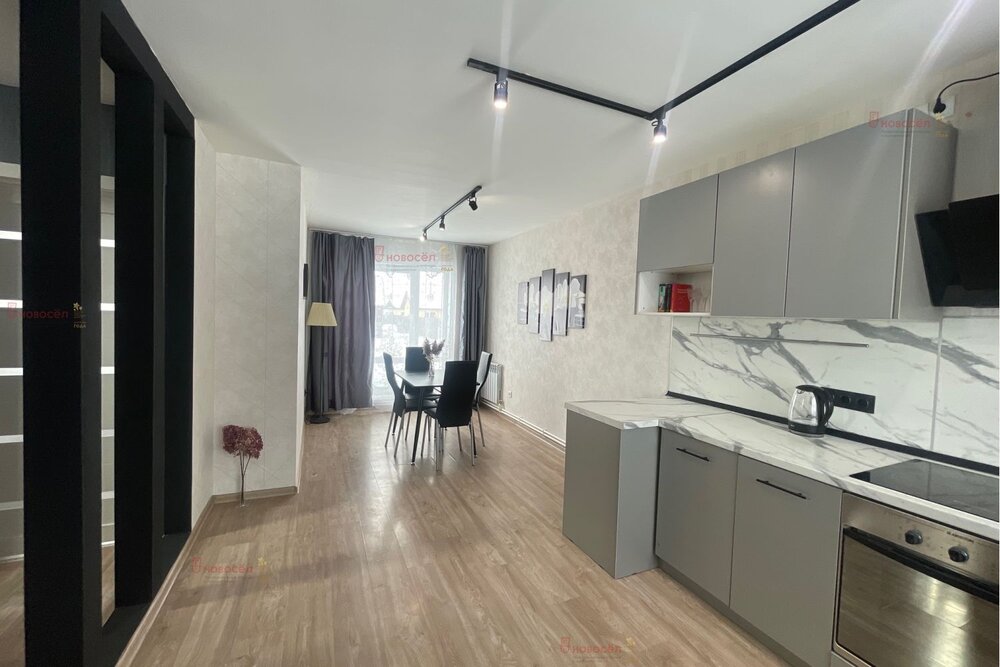 - отделка под ключ, керамогранит на полу, установлены межкомнатные двери, натяжные потолки со светильниками, в санузле плитка.