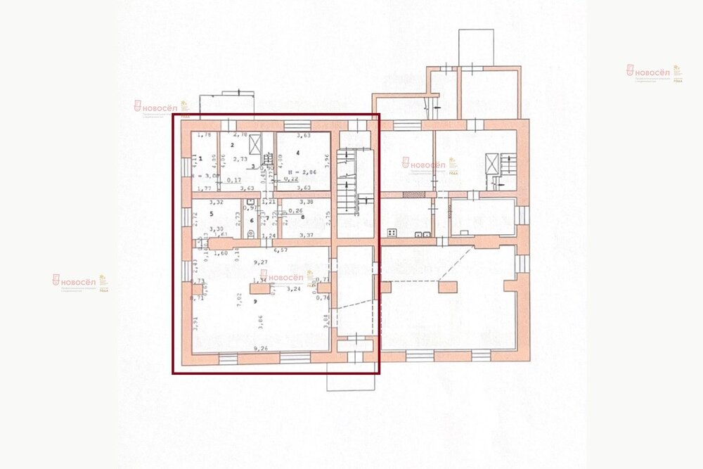 Помещение занимает первый этаж, 121,1 кв.м. и цокольный этаж 148,6 кв.м. Планировка представляет торговый зал и подсобные помещения.