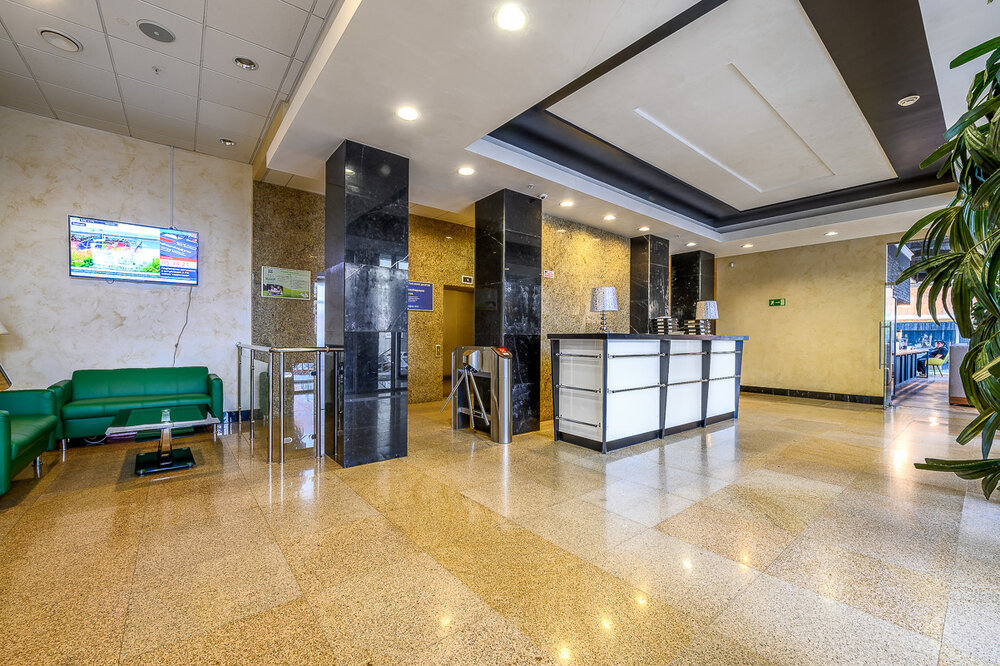 На 1 этаже расположен ресепшен, кафе, охрана. 3 скоростных лифта.