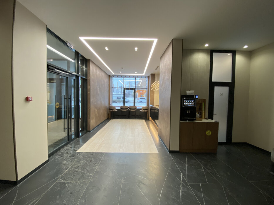 Интерьеры холлов выполнены в **элегантном, минималистичном стиле**, где сочетаются керамогранит и декоративная штукатурка.