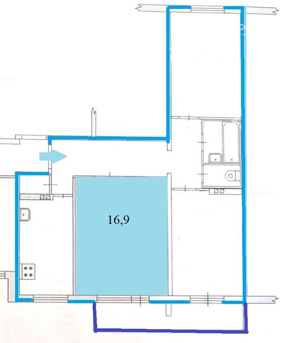Рядом с просторной кухней есть подсобное помещение - можно использовать под кладовую или гардеробную. Комната правильной формы с выходом на застекленную лоджию. Места общего пользования в хорошем состоянии. Установлены счетчики. Во второй комнате проживает один мужчина, работающий, порядочный. В третьей комнате многие годы никто не проживает.
