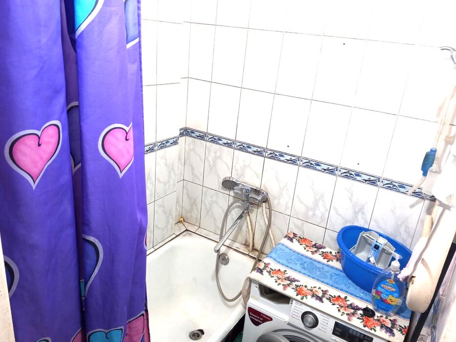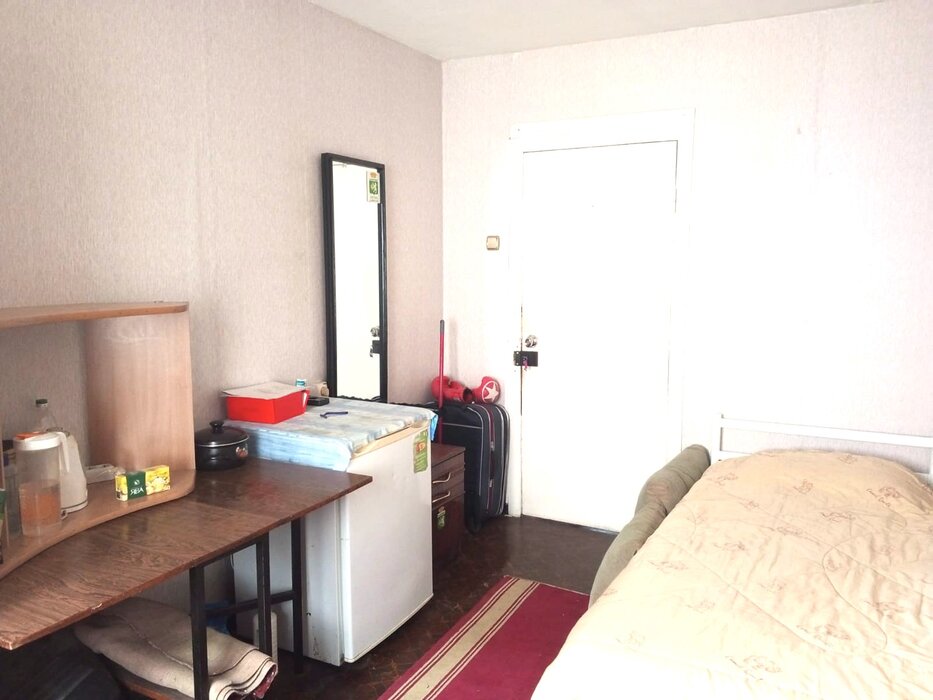 КОМНАТА разделена на две зоны – зона кухни и комнаты. В комнату подведена вода, стоит кухонный гарнитур. Натяжной потолок, в квартире и комнате запахов нет. Все соседи доброжелательные. Квартира содержится в чистоте. Хорошая входная дверь.